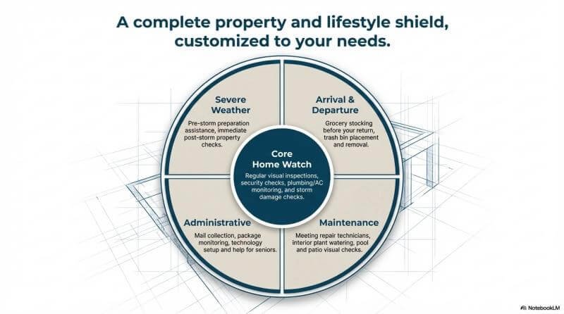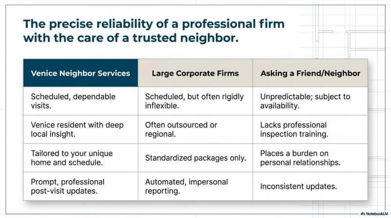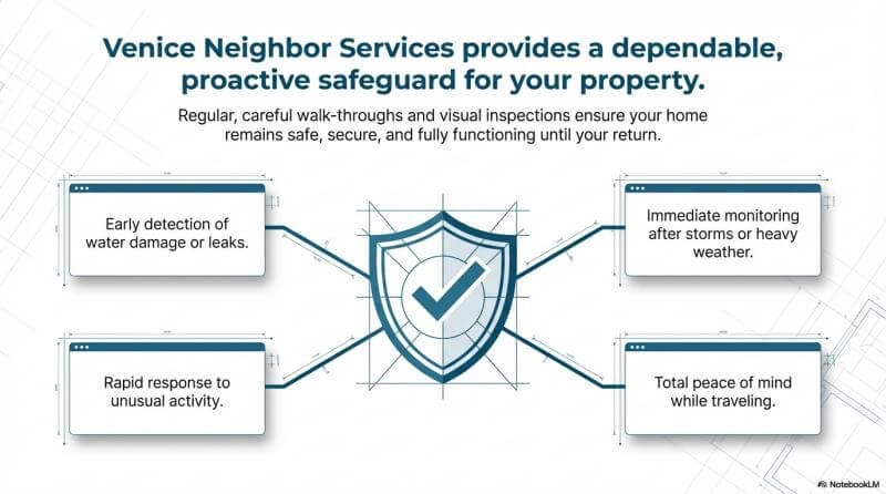 Hiring a professional service offers guaranteed consistency. A company like Venice Neighbor Services provides a dedicated $49 per month Peace of Mind Home Watch Plan. This includes priority scheduling, private video walk-throughs, and detailed reports. You can actually see every room and entry point through an unlisted YouTube video. If you need a personal concierge Venice FL expert to handle repairs, meet technicians, or provide senior services Venice FL for aging relatives, a professional service delivers total reliability.