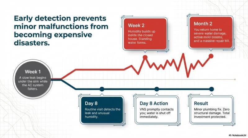 Locking your doors and windows keeps unauthorized people out, but it does nothing to stop environmental and mechanical failures. Houses are designed to be lived in. When water stops flowing through the pipes and the air conditioning runs without supervision, the house begins to suffer.